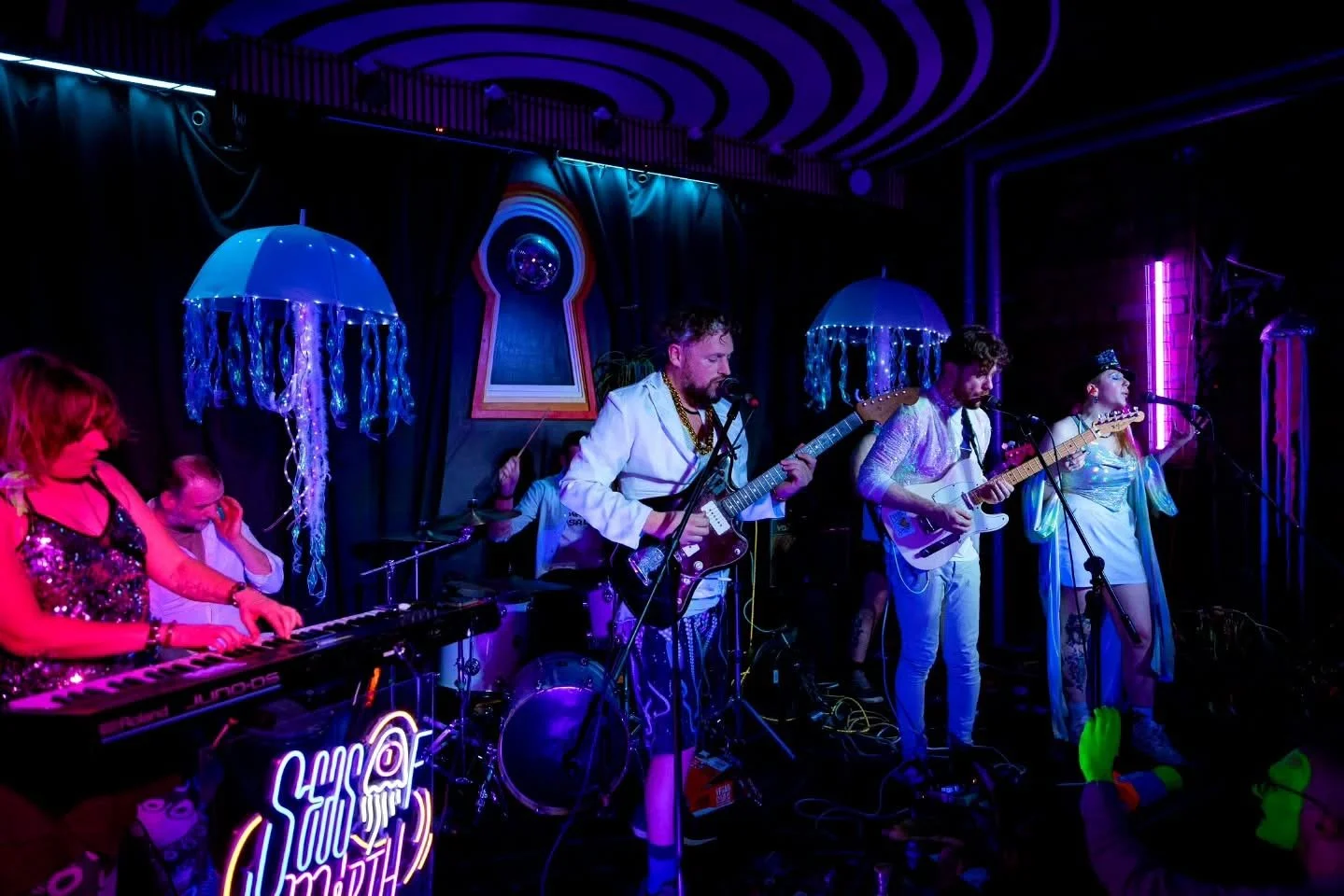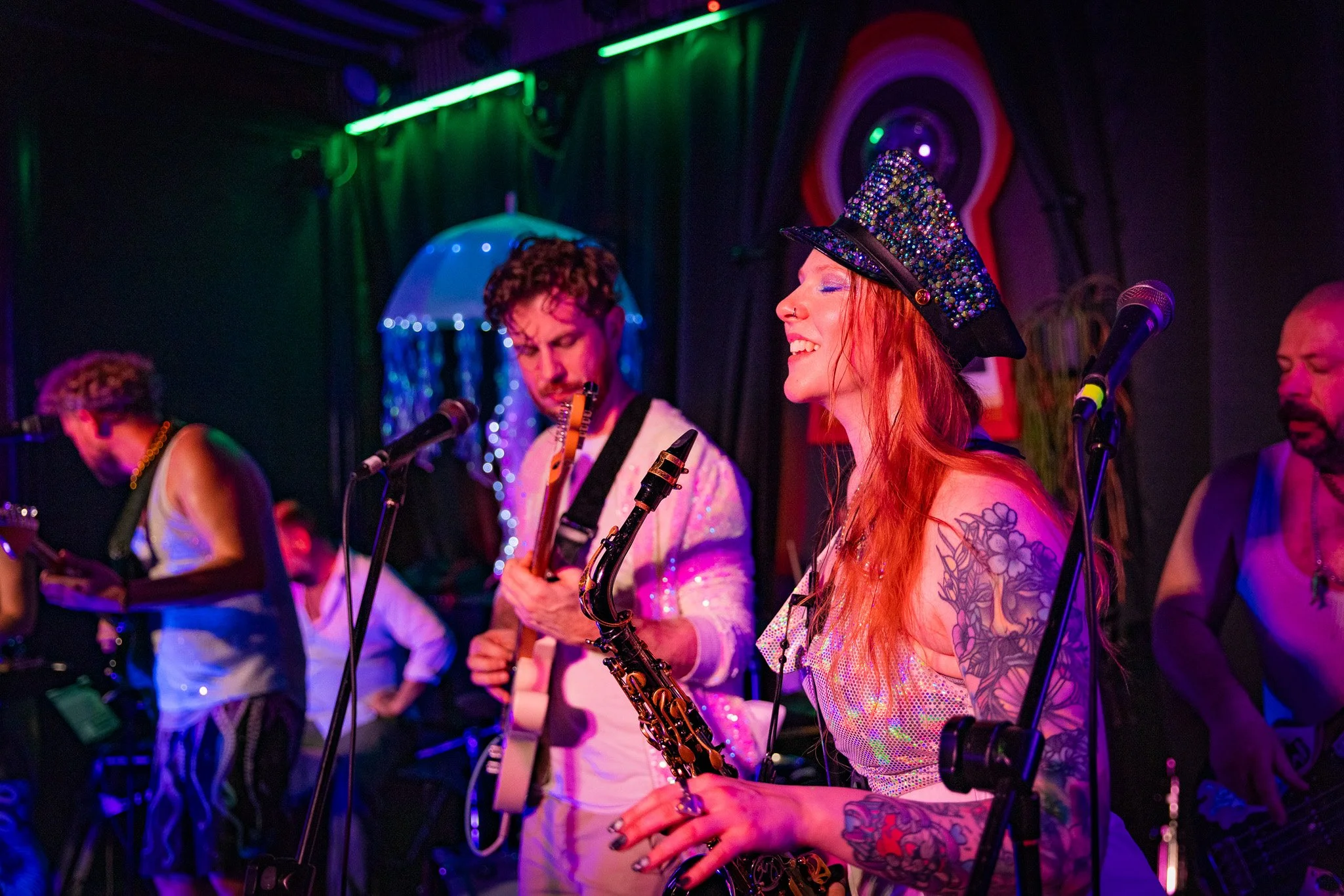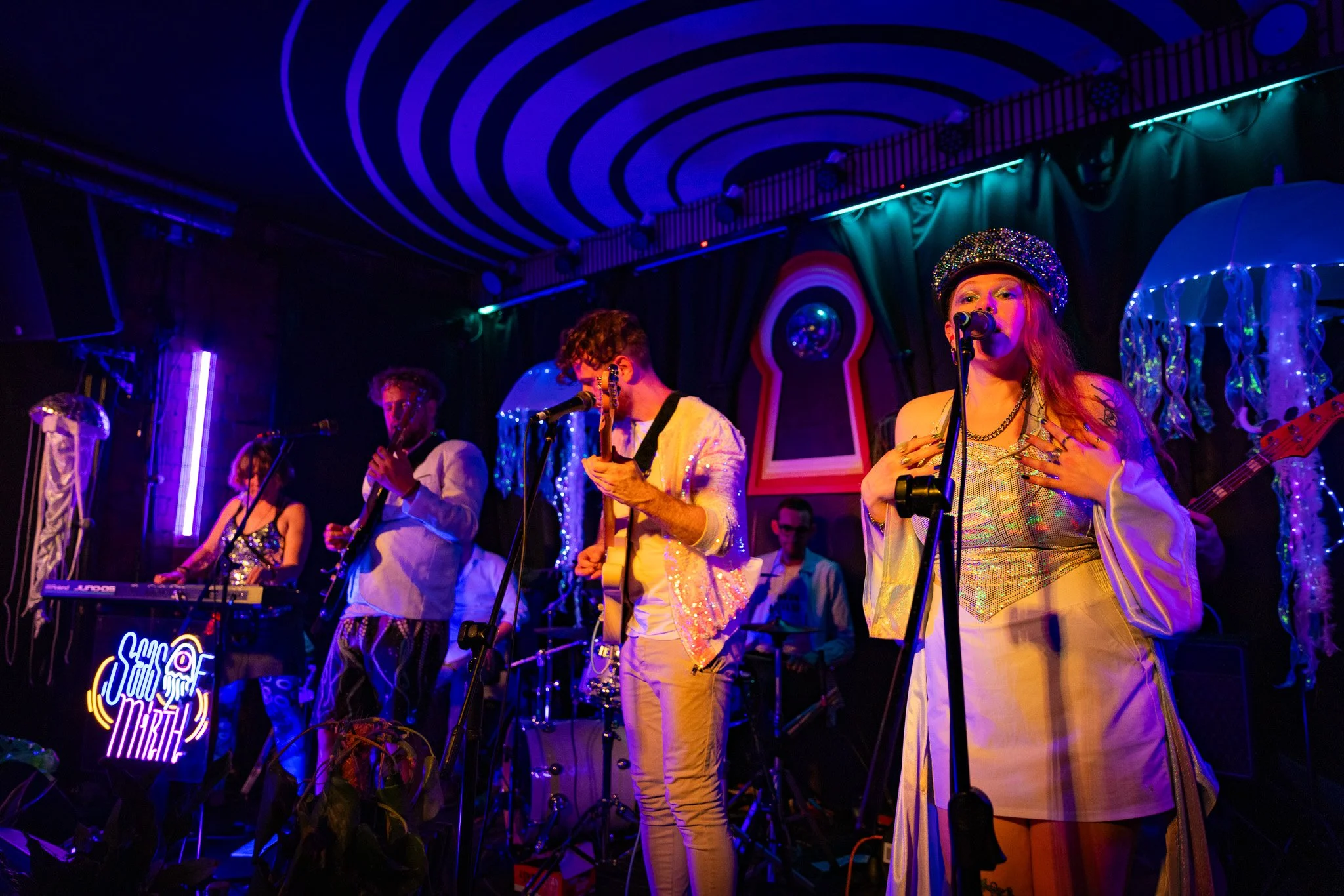 Seas of Mirth are a high energy multi-genre band with a interactive deep sea twist… from the East Midlands. Fronted by two co-founding guitarists Al Judders and Tidal Paul since the earliest conception in the late noughties, the band currently dabble in everything from worldly dance beats to wonky disco funk to psychey prog-folk, while the visual element is full on too with UV lights, bubbles, flamboyant white costumes and LED sea creatures on stage and in the crowd.. plus a regular traditional tug of war for good measure. It’s one big sensory experience that has gone down a treat for many years now at festivals such as Glastonbury, Boomtown, Bearded Theory, Nozstock, Isle of Wight, Lindisfarne, Beat Herder, Maui Waui and Camp Bestival.
